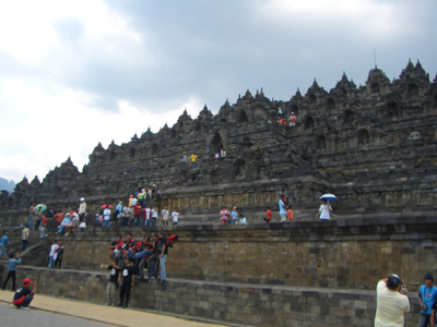 Samstag war dann natürlich das erste was man in Yogya und Umgebung sieht: Der Borobudur! Ein Riesenbuddhatempel mit allem möglichen Schnörkel und da es Wochenende war natürlich auch mit Massen von Einheimischen Touristen! Memo an mich: Wenn im Reiseführer steht am Wochenende sind die Indonesier auf Tour - glauben!!! ABer es war trotzdem schön, die Aussicht vom obersten Punkt ist einfach super. Und wenn man durch ein Gitter an den Fuß (als Mädel) oder an den Ringfinger (als Mann) komt, darf man sich was wünschen... Ich mit meinen Gorillaarmen hatte da natürlich nicht so das Problem. Da es mir hier aber wirklich gut geht wusste ich nicht was ich mir wünschen sollte und hab stattdessen was für Shinto, ein Mädel aus der Uni, die mit war, gewünscht. Komm ich jetzt in den Himmel??