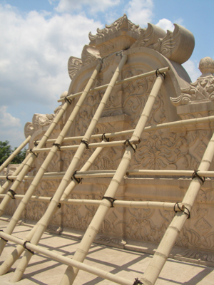 Das Erdbeben in Yogya hat auch den alten Badehäusern der Sultane zu schaffen gemacht, ohen Bambusgerüst wär das schon längst umgekippt.