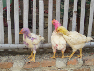 Die spinnen die Indonesier. Da werden kleinen Küken schon die Köpfe angemalt, damit die lustig bunt sind, wenn die Hühner ausgewachsen sind.... Irre.